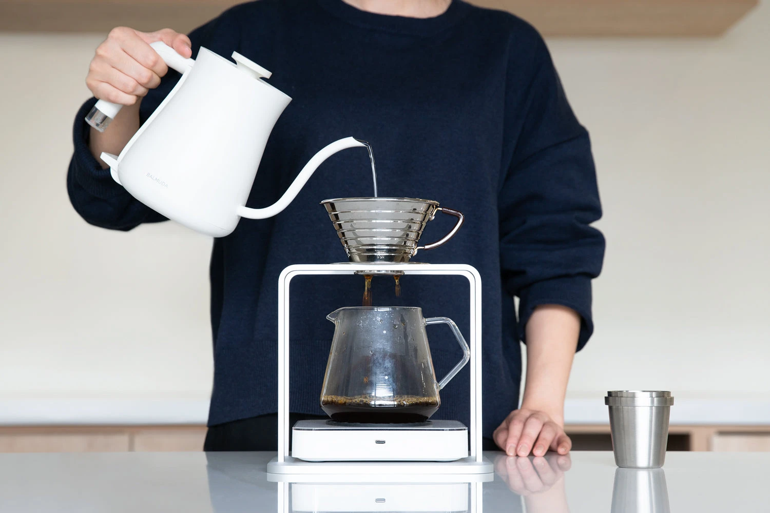 Using the Titan Brew Stand from Acacia for pour over coffee or with the AeroPress just makes sense. With an eight inch wide base, the Pearl series scales fit right on the stand — meaning the scale only catches the beverage weight. The Titan Brew Stand is made of aluminum alloy, so it can withstand even the downward pressure pushed onto an AeroPress. All in all, users will get an accurate extraction read.