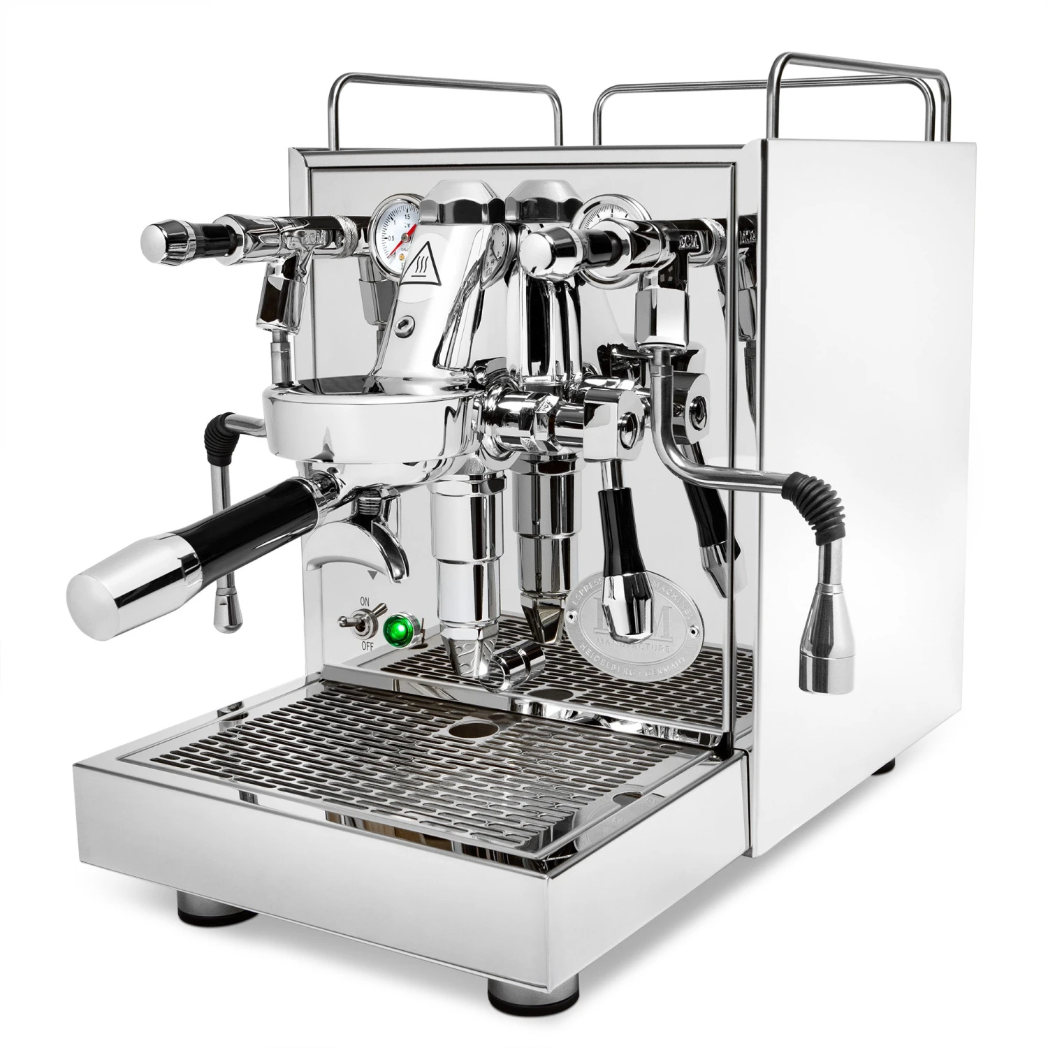 From a design standpoint the Mechanika MAX shares a good amount of DNA with the Mechanika VI Slim with the same cup railings, similar wrapped body panels, and ECM styled E61 group. The steam and hot water valves have received a notable improvement, having been upgraded to spring-loaded chrome tipped joysticks found on the ECM Technika V and Synchronika espresso machines. Similar to those machines, the inclusion of a rotary pump means whisper quiet brewing and allows the machine to be connected directly to a water line.
