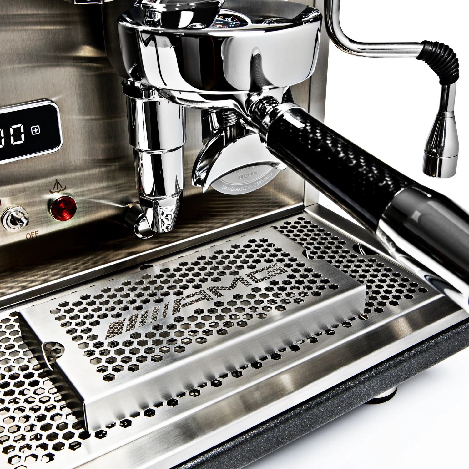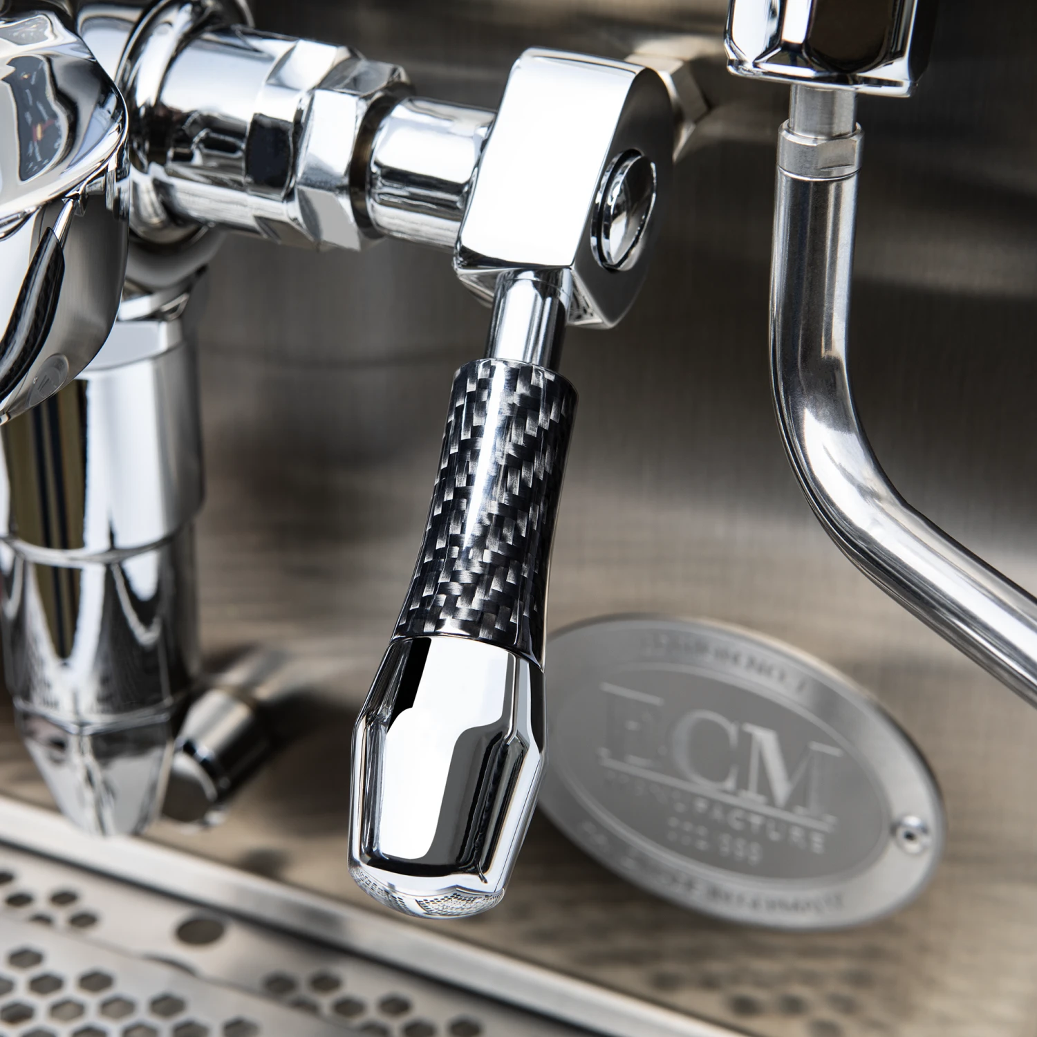 - Carbon fiber portafilter and tamper handles, E61 brew lever, steam and hot water taps.