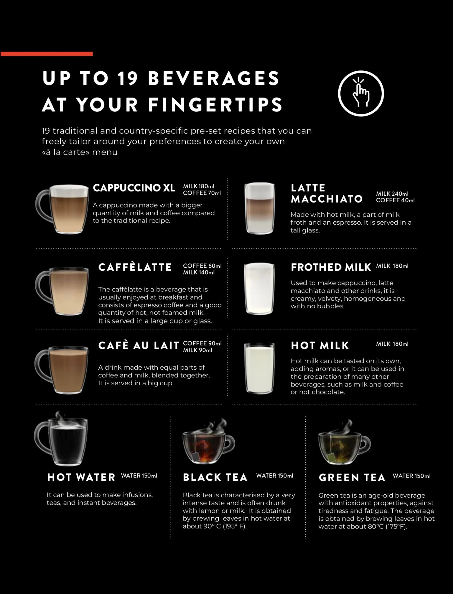 Ristretto, Espresso, Espresso Lungo, Coffee, Americano, Cappuccino, Cappuccino XL, Macchiatone, Melange, Cafe Cortado, Flat White, Caffelatte, Cafe au Lait, Latte Macchiato, Frothed Milk, Hot Milk, Hot Water, water for Black Tea, water for Green Tea