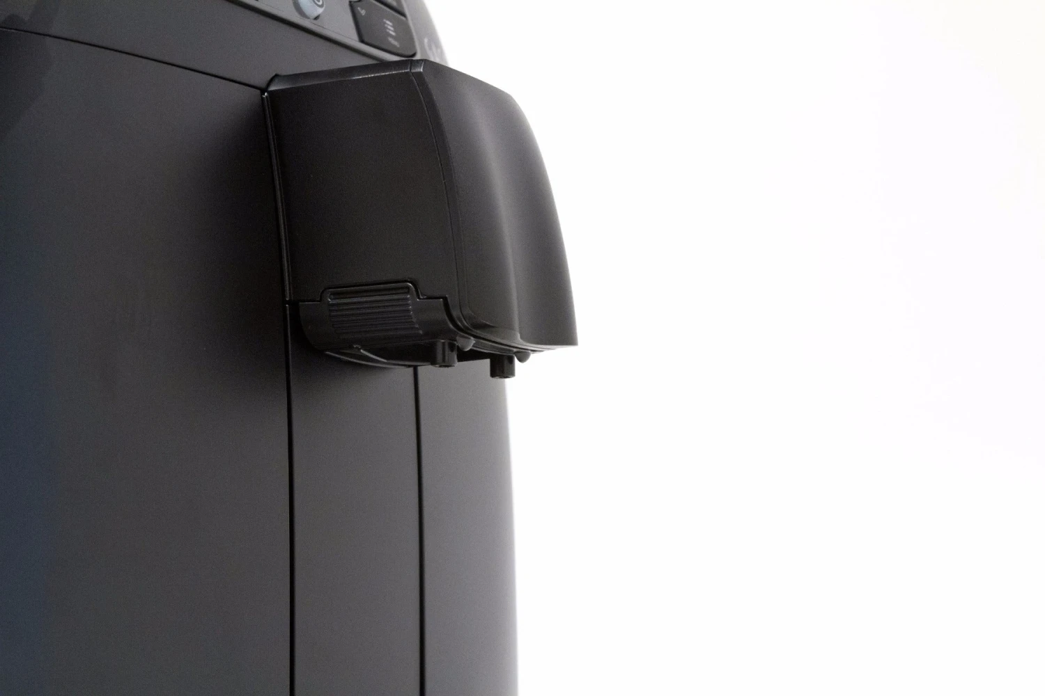 Your choice of espresso and espresso lungo are available on demand via dedicated brew buttons on the left side of the display. Each button can be programmed to your desired volume by pushing and holding it until “memo” appears on the screen. You can also grind and brew twice in a row simply by pressing the button two times in quick succession. On the right side of the machine the dedicated buttons for steaming and hot water allow you to froth milk or dispense water via the steam wand. The pannarello design of the wand automatically aerates milk to a rich and creamy foam while the black plastic matches the black houses and is easier to clean.