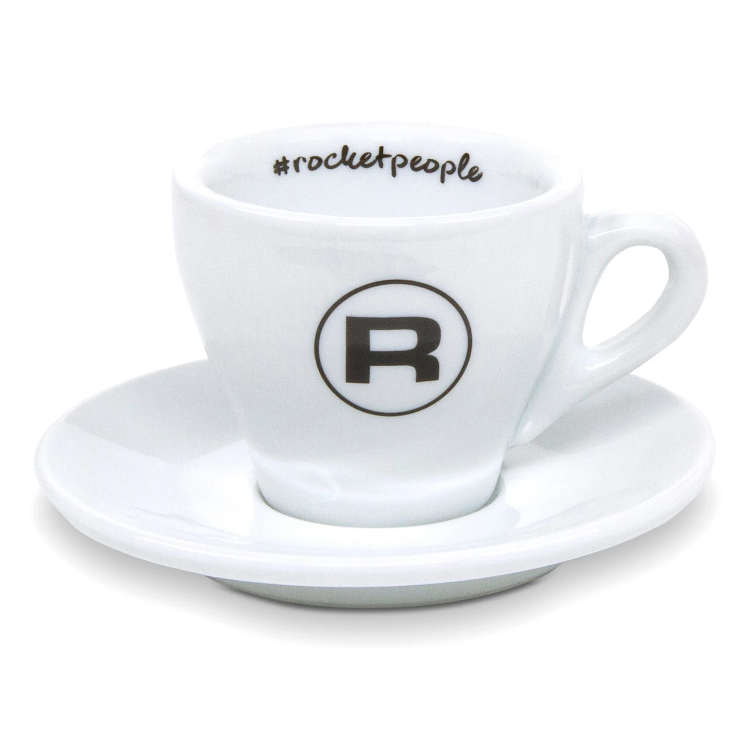 This classically designed espresso cup and saucer set includes six cups with the iconic ‘R’ Rocket logo and #rocketpeople script painted inside the rim. Enjoy the timeless aesthetic with each sip! Made from high quality porcelain, these cups can hold up to 2.5 fluid ounces. Each saucer measures 4.5 inches in diameter and comfortably seats each cup in the center.