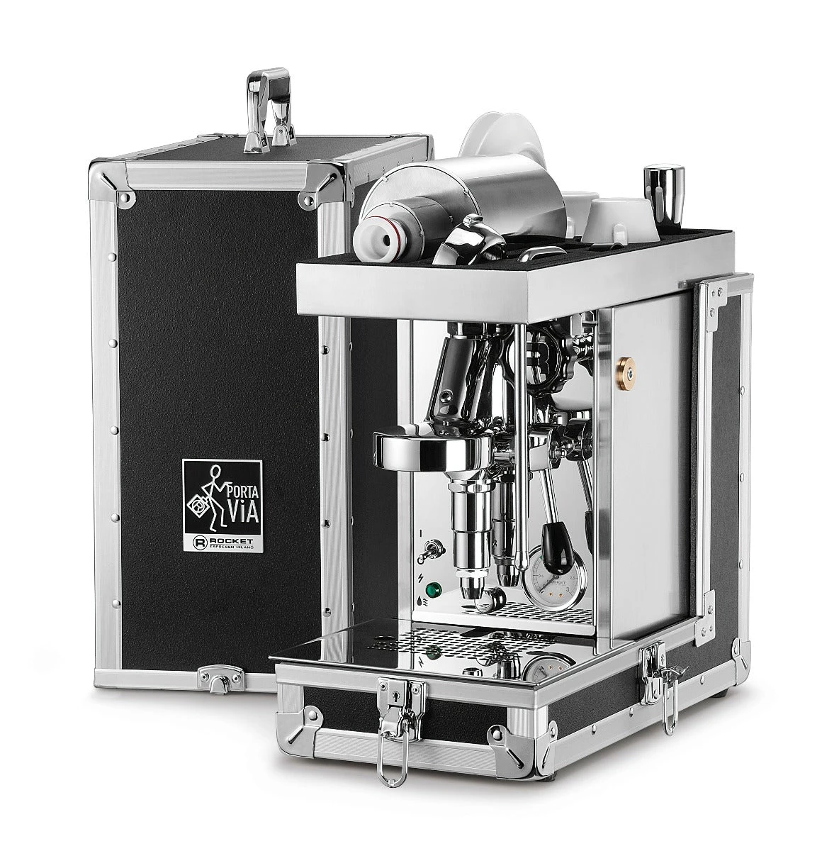 Rocket’s most unique espresso machine, the Porta Via, is being touted as the world’s first truly portable espresso machine. The name, Italian for “take away,” describes its unusual ability to be packed up in a rugged carrier, similar to a musician’s road case, and transported from place to place. The Porta Via doesn’t skimp on quality components, either. Rocket equipped this unique machine with a 40 oz heat exchange boiler and traditional E61 group, which continuously syphons water from the boiler through the group and back, leading to serious temperature stability while brewing.